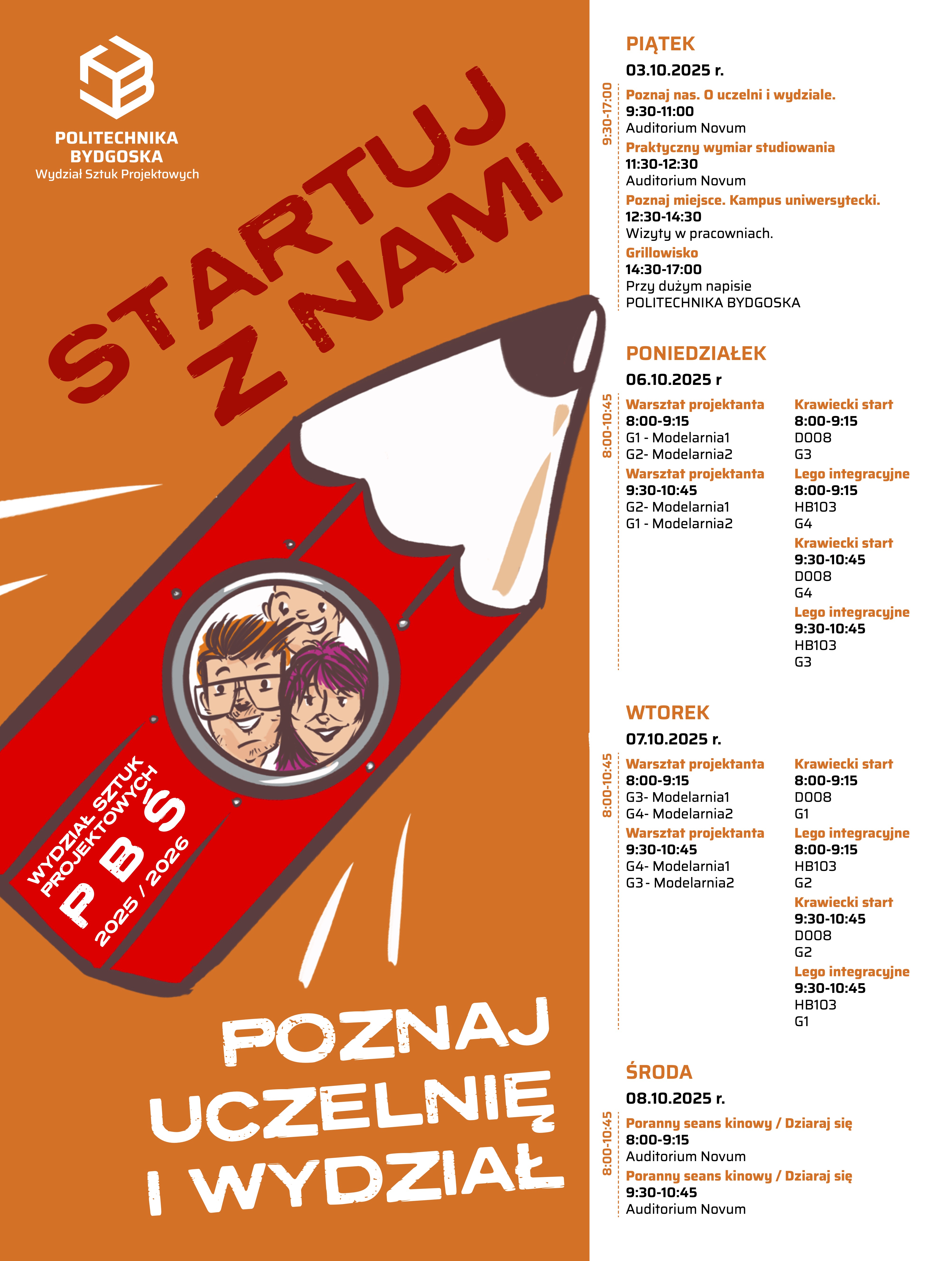 To będzie łagodne lądowanie w naszej społeczności – poznacie lepiej uczelnię, pracownie oraz siebie nawzajem. Odkryjecie przestrzenie, w których już wkrótce rozpoczniecie twórczą pracę. „INTRO” to czas na integrację całego pierwszego roku – Wzornictwo PBŚ i Komunikacja Wizualna PBŚ.