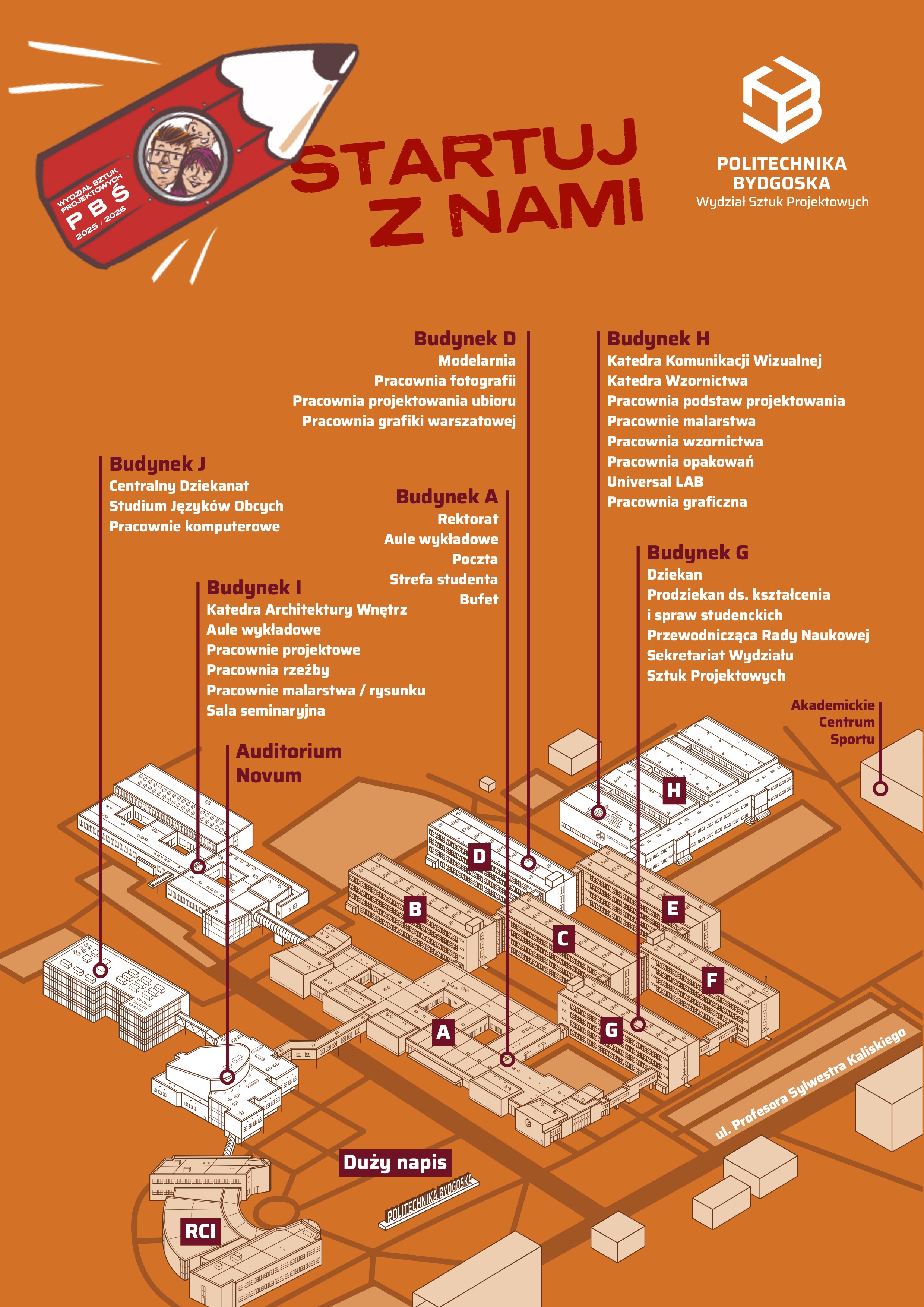 Poniżej mapka naszego kampusu - ułatwi Wam w dotarcie w najwążniejsze miejsca związane ze studiowaniem na Politechnice Bydgoskiej.