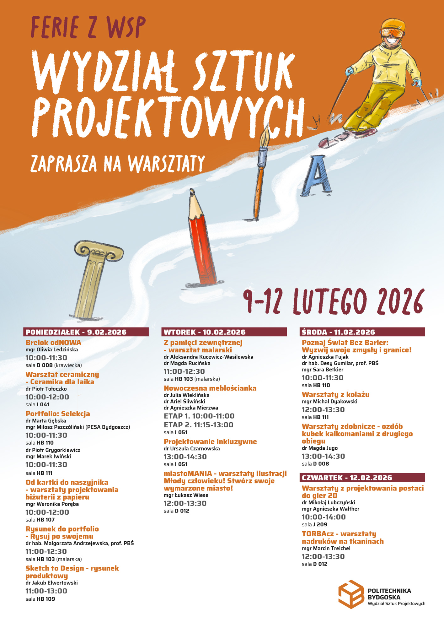 To już trzecia edycja warsztatów dla młodzieży, organizowanych przez Wydział Sztuk Projektowych Politechniki Bydgoskiej, która odbędzie się w drugim tygodniu ferii zimowych w województwo kujawsko-pomorskim, czyli od 9 lutego do 13 lutego w fordońskim kampusie uczelni.